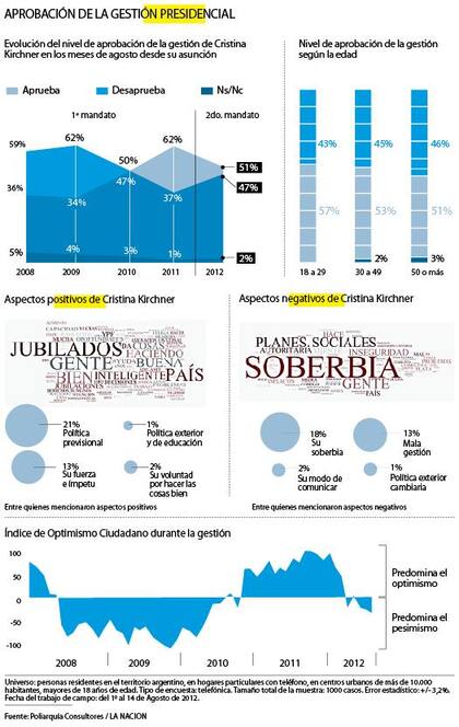 ¿Cómo afecta eso en la imagen presidencial? A diferencia de otras encuestas que circularon en las últimas semanas, el estudio de Poliarquía muestra que la gestión de Cristina Kirchner tiene más apoyos que rechazos: 51 contra 47%. El respaldo es menor al del año pasado, pero muy superior al de otros agostos. En 2008 tenía 36 puntos y el año siguiente, 34.