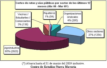 Por este motivo, no es de extrañar que sea ese sector el que más cortes de ruta protagonizó en los últimos doce meses. Según un relevamiento realizado por el Centro de Estudios Nueva Mayoría, el sector de la agroindustria realizó 2923 cortes de ruta y vías públicas, lo que significa un 65% del total, desde abril del 2008 hasta marzo del 2009.