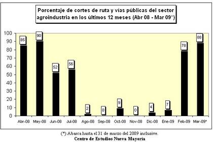 Según el análisis mensual del porcentaje de cortes de ruta y vías públicas del sector de la agroindustria, abril y mayo fueron los meses con mayor porcentaje de cortes realizados por el agro: 85% (170 cortes) en abril y 9 de cada 10 en mayo (833 cortes), con lo que se llegó al pico mas alto. En lo que va del 2009, la mayor participación del agro fue en febrero con el 78 % (66 cortes) y marzo con el 88% (541 cortes).
