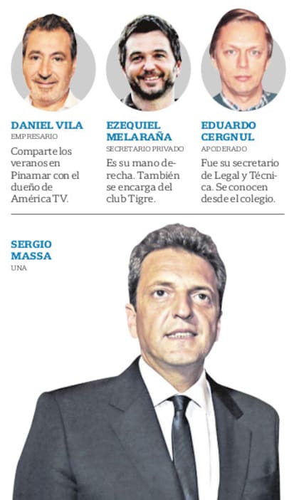 A diferencia de Macri, Massa cuenta con la primera referente en su propia casa: Malena Galmarini. Sus allegados todavía recuerdan que los lunes eran días de trabajo agotador durante la gestión de Massa en Tigre, después de pasar el fin de semana junto a su mujer. El círculo íntimo lo completan Ezequiel "Kelo" Melaraña y Eduardo Cergnul. Para hablar de dinero, en cambio, el líder de Frente Renovador elige a Jorge Brito y Daniel Vila.