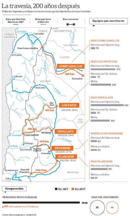 Esta vez, la operación militar argentino-chilena reunirá a 671 militares de ambos países (60 argentinos y 70 chilenos), que atravesarán los pasos seguidos por el Ejército de los Andes. Irán con 359 mulas y caballos, además de vehículos (camionetas, jeeps y helicópteros), para apoyo logístico.