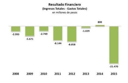 El déficit financiero de la provincia de Buenos Aires de 2015 fue de 21.470 millones de pesos, el más alto en los ocho años de Gobernación de Daniel Scioli y con un deterioro de 22.270 millones en relación con el superávit de 800 millones de pesos de 2014.