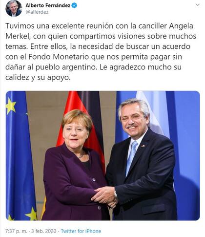 BERLÍN.- Angela Merkel y Alberto Fernández largaron una carcajada juntos apenas abandonaron los atriles donde dieron la declaración conjunta y salieron del alcance de las cámaras. Fue cuando ella le señaló a un fotógrafo ubicado en primera fila vestido con un traje que emulaba la camiseta de fútbol de Alemania.