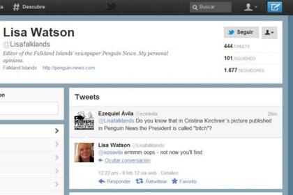Desde su cuenta de Twitter, Lisa Watson , editora del diario kelper, que hace unos días fue entrevistada por LA NACIÓN, y aseguró que "los isleños le deben lealtad a Gran Bretaña" , fue consultada por el usuario Ezequiel Ávila sobre el hecho, y ella respondió: "Emmm ups, ahora no la vas a encontrar", y atribuyó el insulto al "humor ácido del staff" del Penguin News.