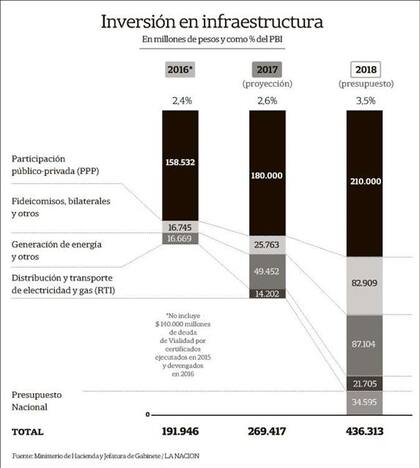 Más allá del optimismo oficial, la merma en la inversión estatal es y será evidente. Los datos oficiales del Ministerio del Interior hablan de una suba de sólo $ 2500 millones de inversión en infraestructura de este año al próximo. Según los cálculos de ese ministerio, y contabilizando la inflación, se trata de un recorte del 12% en presupuesto para obras. La inversión total proyectada en infraestructura será en 2018 del 3,5% del PBI, contra el 2,5 en 2017, pero los números para el año que viene incluyen los fondos provenientes del PPP (ausentes este año). "En la discusión del presupuesto es probable que muchas provincias negocien más dinero para obras", afirmaron cerca de Frigerio.