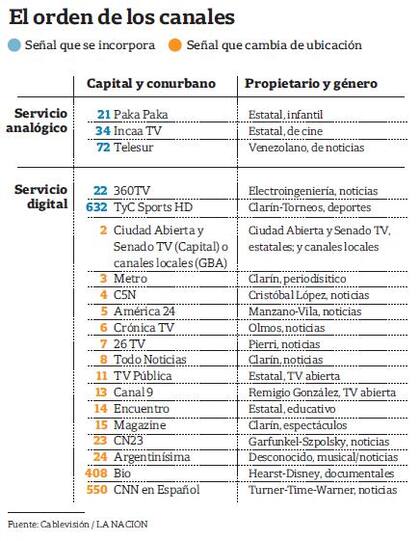TN pasará al canal 8, mientras la gubernamental TV Pública estará en el número 11, entre Telefé y El Trece, los dos de mayor audiencia. Habrá que prestar atención y ver si a partir de ahora los siempre escuetos números de rating de la televisión estatal se modifican al quedar en medio de las dos cadenas de mayor audiencia. También cambiarán de lugar el Canal 9, que pasará al número 13, y América TV, al 9 (más cerca de los lugares de mayor rating).