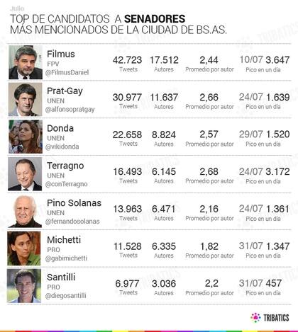 Según el infome, al que accedió LA NACION, Daniel Filmus fue el precandidato a senador por la Ciudad de Buenos Aires que mayor volumen de menciones acumuló en Twitter durante el mes de Julio con 42.723 Tweets realizados por 17.512 autores únicos (un promedio de 2,44 Tweets por autor). Detrás se ubicaron Alfonso Prat Gay y Victoria Donda con 30.977 y 22.658 Tweets respectivamente. Con ese registro, el candidato del Frente Para La Victoria se quedó con el 29.4% del total de menciones del ranking y logró diferenciarse por 8.1% de su perseguidor inmediato. Por su parte, los dos precandidatos de UNEN obtuvieron el 21,3% y 15,6%. La performance con menor impacto del mes fue la de Diego Santilli, precandidato del Pro, quien representó el 4,8% de las menciones totales.