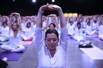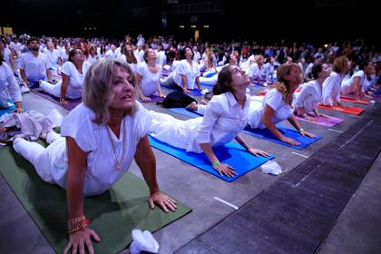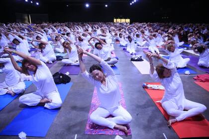 Cientos de personas vestidas de blanco hicieron yoga sobre sus mats, mientras que otros realizaron ejercicios menos complejos sentados en sus sillas. También hubo lugar para las melodías indias de una banda de 70 músicos y para que Patricia Sosa cantara la canción La verdad y el amor.