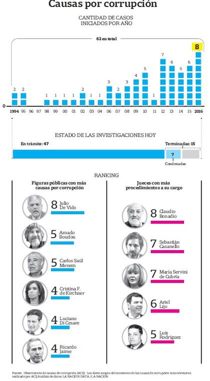 El podio lo completan, con tres casos cada uno, Aníbal Fernández y Ricardo Jaime, el único ex funcionario condenado y preso. Con dos expedientes fueron relevados otros 11 políticos y empresarios.