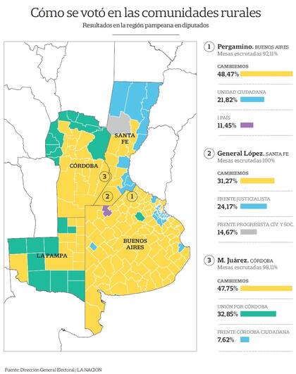 Como en 2015, el oficialismo consolidó el apoyo del campo y ganó por amplio margen en las zonas agrarias más importantes de Buenos Aires, Córdoba y Santa Fe; en Pergamino y Marcos Juárez, logra casi el 50% de los votos