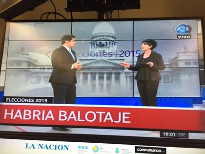 Instantes después de las 18 (incluso antes, en algún caso), los canales de televisión mostraron sus pronósticos antes de conocer datos oficiales. "Ganó Scioli por amplia diferencia", dijo C5N sin precisar si evitará la segunda vuelta, "Habría ballottage", aventuró A24, "Ganó Scioli", se leyó en Crónica TV. TN noticias permaneció con la incógnita sobre la segunda vuelta.