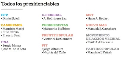 Margarita Stolbizer, la única candidata de Progresistas, también buscará dar la sorpresa. Mientras tanto, en la izquierda, Jorge Altamira y Nicolás del Caño pelean por ser el candidato del FIT, y Alejandro Bodart (MST); Víctor De Gennaro (Frente Popular), y Manuela Castañeira (MAS) buscan pasar el piso del 1,5%.