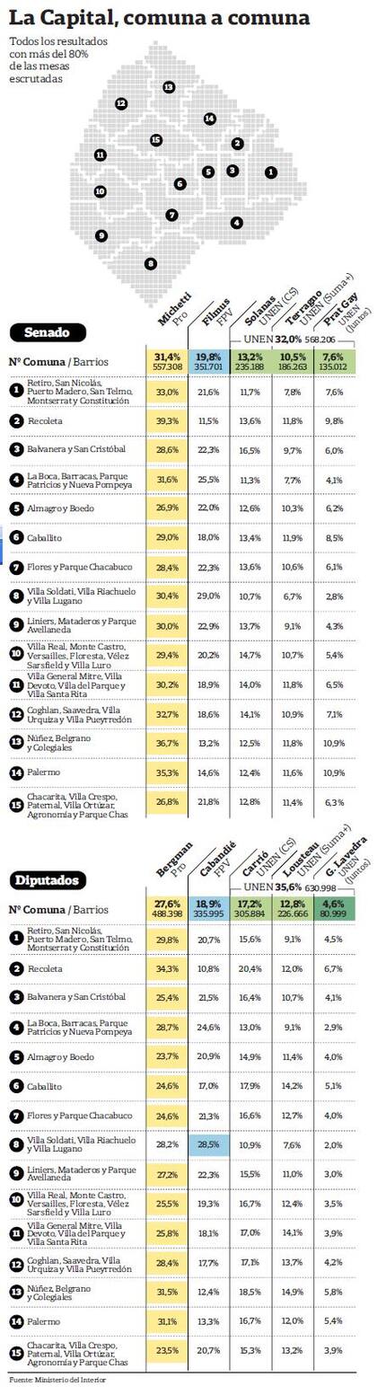 En la ciudad de Buenos Aires, el corte de boleta se hizo sentir tanto en Pro como en UNEN: en la primera fuerza, Sergio Bergman, candidato a diputado, recibió muchos menos votos que su compañera para el Senado, Gabriela Michetti, mientras que fue la candidata a diputada Elisa Carrió (UNEN-Coalición Sur) la que parece haberse beneficiado claramente con buena parte de ese corte.