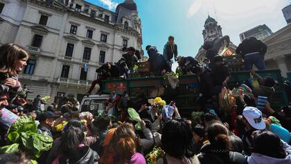 Los pequeños productores agrícolas de la provincia de Buenos Aires regalaron 20.000 kilos de verduras a cientos de personas que los esperaron durante más de 5 horas en la Plaza de Mayo. El reparto gratuito de lechuga, acelga, cebolla, apio, zanahoria y brócoli fue como parte del “verdurazo”, una protesta de trabajadores rurales para visibilizar los problemas que tienen para acceder a las tierras. Tras la manifestación en el Congreso y la entrega de los vegetales, fueron convocados para reunirse mañana con autoridades del Ministerio de Economía de la Nación.