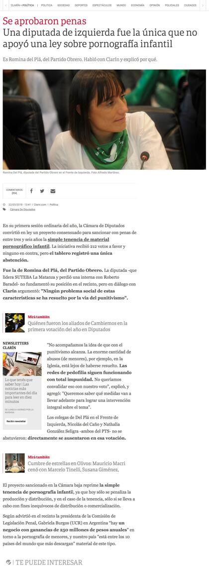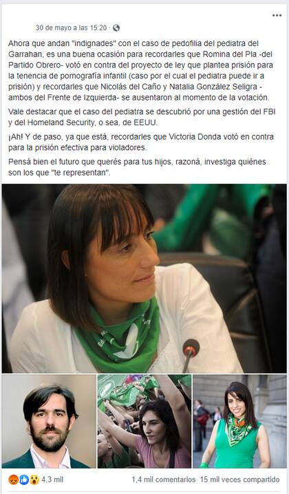 Ricardo Russo, jefe del Servicio de Inmunología y Reumatología del Hospital Garrahan, fue detenido el último 29 de mayo, acusado de distribución y producción de imágenes de abusos sexuales infantiles. En ese marco, circula una publicación en Facebook que afirma que Romina Del Plá, diputada nacional por el Frente de Izquierda y de los Trabajadores (FIT), "votó en contra del proyecto de ley que plantea prisión para la tenencia de pornografía infantil". El posteo también afirma que Nicolás del Caño y Natalia González Seligra -ambos también legisladores nacionales del FIT - "se ausentaron al momento de la votación" y, finalmente, que Victoria Donda se opuso a un supuesto proyecto de ley "para la prisión efectiva para violadores".