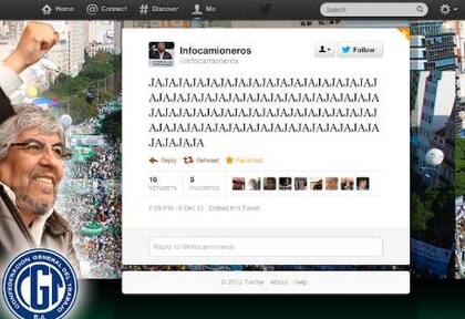 Ahora, un tuit en la cuenta @infocamioneros irritó a Hugo Moyano de tal manera que el camionero optó por dar de baja la cuenta en la red social. El jueves, al conocerse la decisión de la Cámara Federal Civil y Comercial que extendió la medida cautelar a favor del Grupo Clarín, se puedo leer en twitter una larga carcajada en forma de tuit.