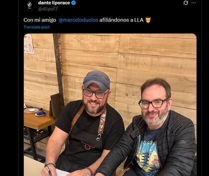 “Con mi amigo Marcelo Duclos afiliándonos a LLA”, señaló Liporace por redes social, al compartir una imagen junto al biógrafo del presidente Javier Milei.