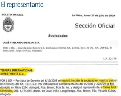 En cuatro líneas, el anuncio publicado en el Boletín Oficial bonaerense en julio de 2009 informó la inscripción en el país de la firma holandesa Tierras International Investments y la designación de Carlos Schneider como su representante.