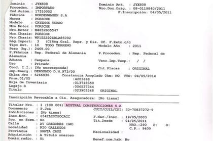 La titularidad la tiene la empresa Austral Construcciones y las cédulas de conducir autorizadas están a nombre de Báez y de sus hijos Leandro y Martín. El domicilio legal de los autos es el pasaje Carabelas 241 de Capital Federal, sede de la mayoría de las empresas del emporio. Pero tiene una guarda habitual otorgada por las autoridades en la calle Gobernador Gregores 290, de Río Gallegos, donde funcionan oficinas de Austral Construcciones. Sin embargo, los cinco autos fueron fotografiados en un galpón de la calle Güer Aike 50, de Río Gallegos, sobre el cual los partidos de la oposición santacruceña solicitaron a la justicia federal que se realice allanamientos urgentes, que aún no fueron realizados.