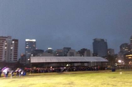 La sala Borges, una hora antes del ingreso de la expresidenta, estaba casi a oscuras. La única iluminación provenía de las dos pantallas del escenario donde hablará Cristina Kirchner. Dentro, además del murmullo de los presentes, se escuchaban los sonidos que provenían desde afuera: los truenos, la lluvia que repiqueteaba contra el techo y los cantos de los militantes que entraron a la feria y se refugiaban del agua bajo un precario techo.