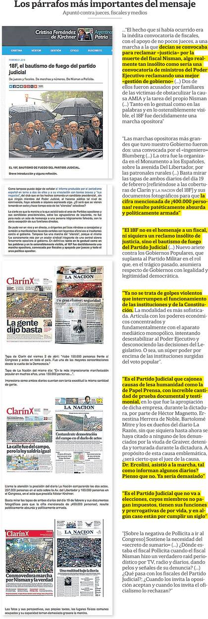 La Presidenta dejó los eufemismos de lado. "El 18-F fue decididamente una marcha opositora, convocada por fiscales y apoyada por jueces y todo el arco político opositor", dijo en su misiva cargada de adjetivos.