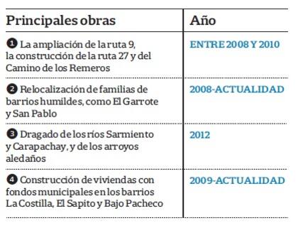 En diálogo con LA NACION, Massa destacó que entre las obras de infraestructura más importantes que se realizaron durante su paso por la intendencia se encuentran la ampliación de la ruta 9 a cuatro carriles; el acondicionamiento de la ruta 27 y el Camino de los Remeros; la relocalización de las familias que habitaban asentamientos, como el conocido El Garrote; la construcción de viviendas con fondos municipales en el barrio La Costilla y algunos con colaboración de la Nación, y los dragados de los ríos Sarmiento y Carapachay y arroyos aledaños. Massa se jactó de haber llevado adelante obras cuyo financiamiento correspondía al gobierno de Daniel Scioli, como las hidráulicas. Sin embargo, el actual candidato kirchnerista a intendente de Tigre, Sergio Szpolski, tiene como una de sus banderas de campaña que el 80% de las obras públicas se hicieron con presupuesto nacional a pesar de tener la capacidad financiera, según denunció en el lanzamiento de su candidatura a suceder a Julio Zamora, quien hoy gobierna el municipio y busca la reelección.