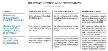 La mirada de la Anses es totalmente opuesta. Si bien Peña informó en el Congreso que la meta oficial ahora es de "cerca de dos millones" de beneficiarios, las autoridades del organismo manifestaron que el porcentaje de casos liquidados en los primeros ocho meses "es la prueba del éxito alcanzado por la propuesta". Agregaron que desde agosto pasado se otorgaron 350.000 nuevas jubilaciones y pensiones que deberían considerarse parte de la reparación histórica porque se calcularon con los índices correctos.