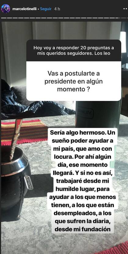 El conductor eligió otra pregunta política: sobre su posible postulación a la Presidencia: "Sería algo hermoso, un sueño poder ayudar a mi país, que amo con locura", dijo. "Por ahí, algun día en ese momento llegará. Y si no es así, trabajare desde mi humilde lugar para ayudar a los que menos tienen, a los que están desempleados, a los que sufren la diaria, desde mi fundación".