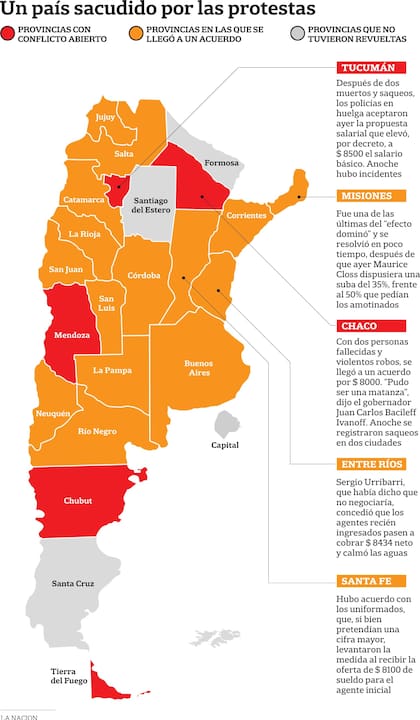 El reclamo policial de aumento salarial se extendió por casi todo el país: sólo en cuatro distritos no se registraron rebeliones ni saqueos en los últimos días