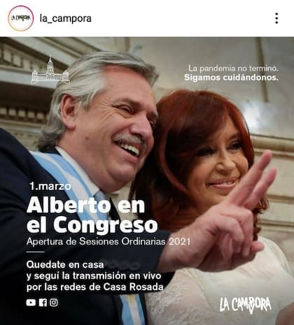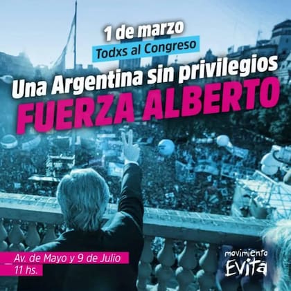 - En el volante de la convocatoria del Movimiento Evita a una movilización en Av. De Mayo y 9 de Julio para acompañar al Presidente en el día de la apertura de sesiones del Congreso se lee: "Una Argentina sin privilegios, fuerza Alberto". Este organismo es el corazón del albertismo porque se diferenció de Cristina, como él en aquel entonces, y quebró el bloque opositor en el Congreso cuando aparecieron los bolsos de López. La Cámpora divulgó después una foto del jefe de Estado junto a la vicepresidenta, y una leyenda que invita a "quedarse en casa y seguir la transmisión en vivo por las redes de Casa Rosada". De esta manera, le bajaron el acto a Fernández quien, en medio de estos dos mensajes, publicó un tuit pidiendo "dar el ejemplo" y seguir el discurso de manera remota.