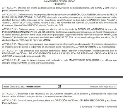 A través del Boletín Oficial , bajo la Resolución 423/2018 firmada por Patricia Bullrich , el Gobierno intenta obtener información sobre los dos hombres que están siendo buscados desde febrero de este año.