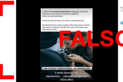 Esta desinformación fue compartida en Facebook 7 mil veces, según la información que ofrece la propia publicación. En la pieza se ve a una mujer aspirando cocaína sostenida en un celular que tiene en su mano, aunque no dice cuándo ni dónde fue tomada la imagen, sólo se afirma que es la diputada nacional, a pesar de que la mujer de la foto es físicamente diferente a Donda.