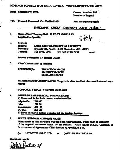 Macri integró, junto con su padre y su hermano Mariano, el directorio de una sociedad offshore registrada en las islas Bahamas desde 1998, identificada como Fleg Trading Ltd. Se trató de una derivación del holding que los Macri habían montado en Argentina y en Brasil. Fleg Trading Ltd. funcionó hasta 2009, año en que Macri ejercía como jefe de Gobierno porteño, aunque los documentos que analizó LA NACIÓN no clarifican si para entonces el actual Presidente seguía vinculado a esa sociedad offshore o ya se había retirado.