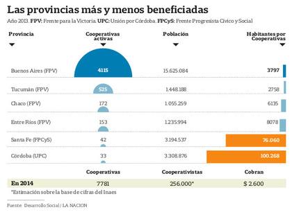 ¿Por qué? Porque de esas 5795 cooperativas admitidas en 2013, 4115 estaban registradas en el conurbano bonaerense. En el otro extremo se ubican Córdoba y Santa Fe, gobernadas por opositores, que apenas recibieron 33 y 42 cooperativas, respectivamente. A otras provincias con menos habitantes y, según el Gobierno, menos desocupados, les fue mejor: las ultrakirchneristas Tucumán (525), Chaco (172) y Entre Ríos (153).