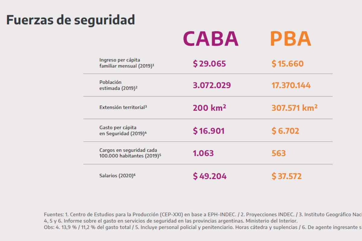 El cuadro que exhibió Fernández consideraba indicadores comparativos correspondientes a las fuerzas de seguridad entre la ciudad de Buenos Aires y el territorio bonaerense como el ingreso per cápita familiar mensual, salarios, o los cargos en seguridad cada 100 mil habitantes. "¿Por qué tanto desequilibrio entre la ciudad y la provincia?", cuestionó el mandatario al destacar las diferencias de recursos, habitantes y extensión, entre las dos áreas.