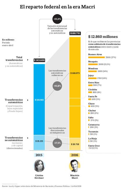 En el primer cuatrimestre del año, el gobierno de Mauricio Macri redujo la distribución de fondos discrecionales a las provincias respecto del manejo que hizo Cristina Kirchner en el mismo período del año pasado. La Casa Rosada realizó transferencias no automáticas (que dependen de la voluntad del Poder Ejecutivo) por un 17,5% menos que el gobierno anterior. En simultáneo, aumentó un 41,8% los fondos remitidos a las provincias de manera automática, que están establecidos por ley.
