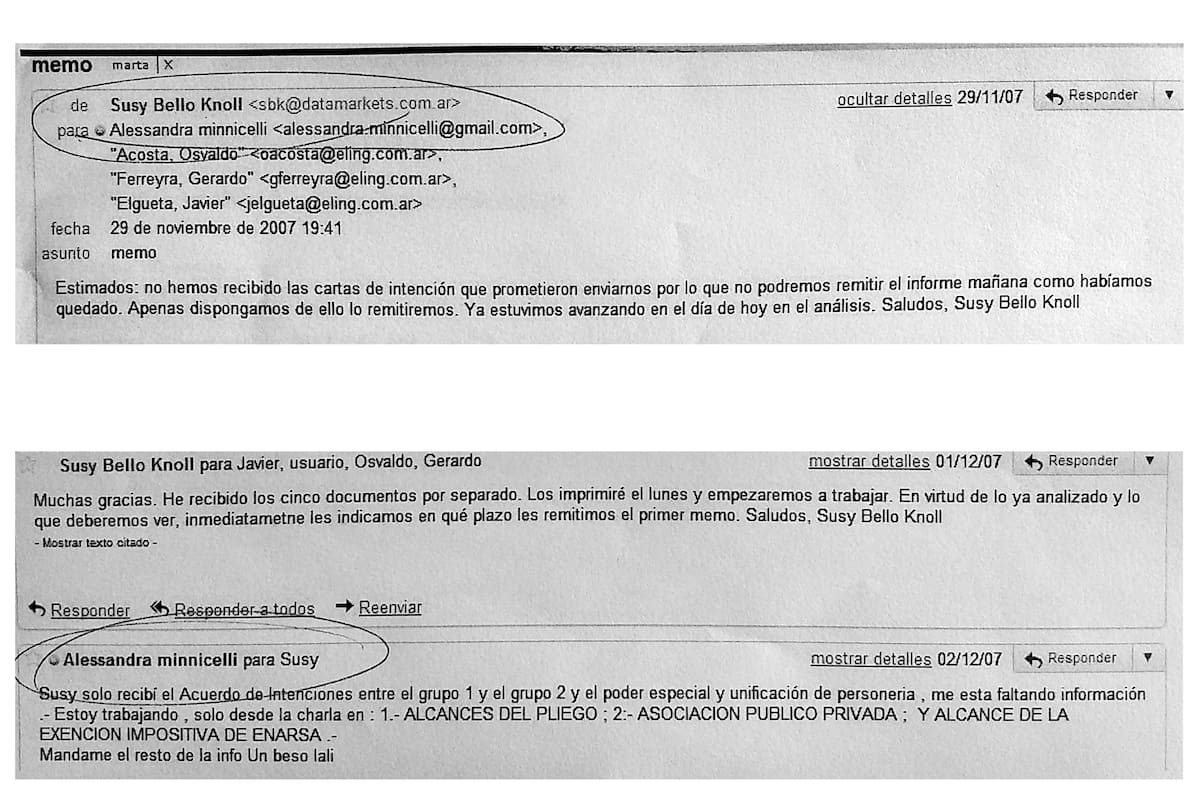 Para esos correos electrónicos, Minnicelli recurrió a una cuenta del servicio Gmail, mientras que Acosta, Ferreyra y Elgueta figuran como receptores desde sus cuentas institucionales de Electroingeniería (eling.com.ar).