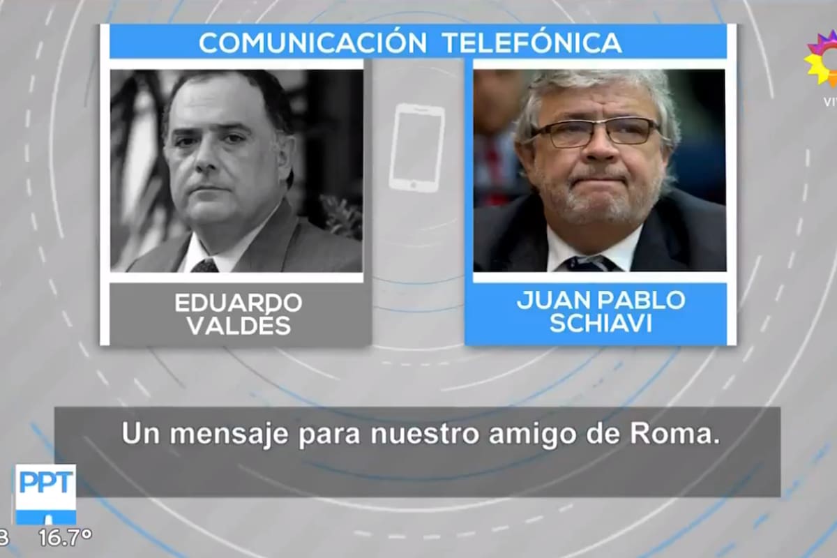 Una conversación privada entre los kirchneristas Eduardo Valdés, exembajador K en el Vaticano, y el exsecretario de Transporte Juan Pablo Schiavi, preso en Ezeiza, revela el rol que deseaban asignarle al Papa Francisco en la campaña presidencial K. El diálogo tuvo lugar el primero de enero de este año, ante un llamado que Valdés le hace a Schiavi al penal de Ezeiza y que fue revelado hoy en el programa PPT, que se transmite por El trece. Además, se refieren a Sergio Massa como "el único hijo de puta (sic) que tenemos que tener adentro" de las listas.