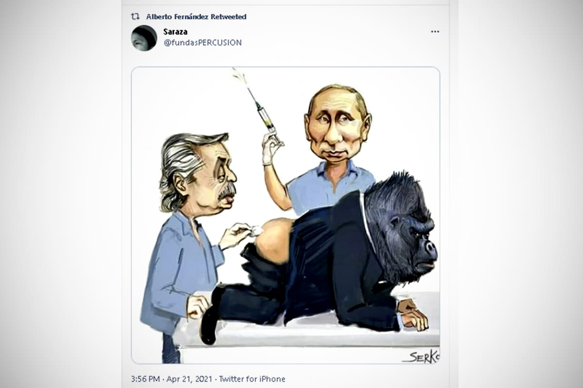 El dibujo, del caricaturista Senko, compartido por un usuario de Twitter, fue también difundido por el Presidente, que minutos después de retuitearlo, deshizo el retuit. En la imagen puede observarse a Fernández junto al mandatario Ruso, Vladimir Putin, a punto de vacunar, con lo que sería una dosis de Sputnik V, a una criatura mitad humana y mitad gorila.
