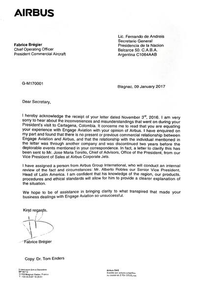 La respuesta de Airbus llegó el 9 de enero, cuando su CEO mundial, Fabrice Brégier, le comunicó por escrito a De Andreis que "no hay una relación comercial en el presente, ni previamente, entre Engage Aviation y Airbus", y le informó que la relación entre Airbus y Salort "fue discontinuada dos años antes de los deplorables eventos mencionados en su carta".