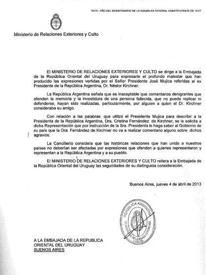 "El Ministerio de Relaciones Exteriores y Culto se dirige a la Embajada de la República Oriental del Uruguay para expresarle el profundo malestar que han producido las expresiones vertidas por el Señor Presidente José Mujica referidas al ex Presidente de la República Argentina, Dr. Néstor Kirchner.