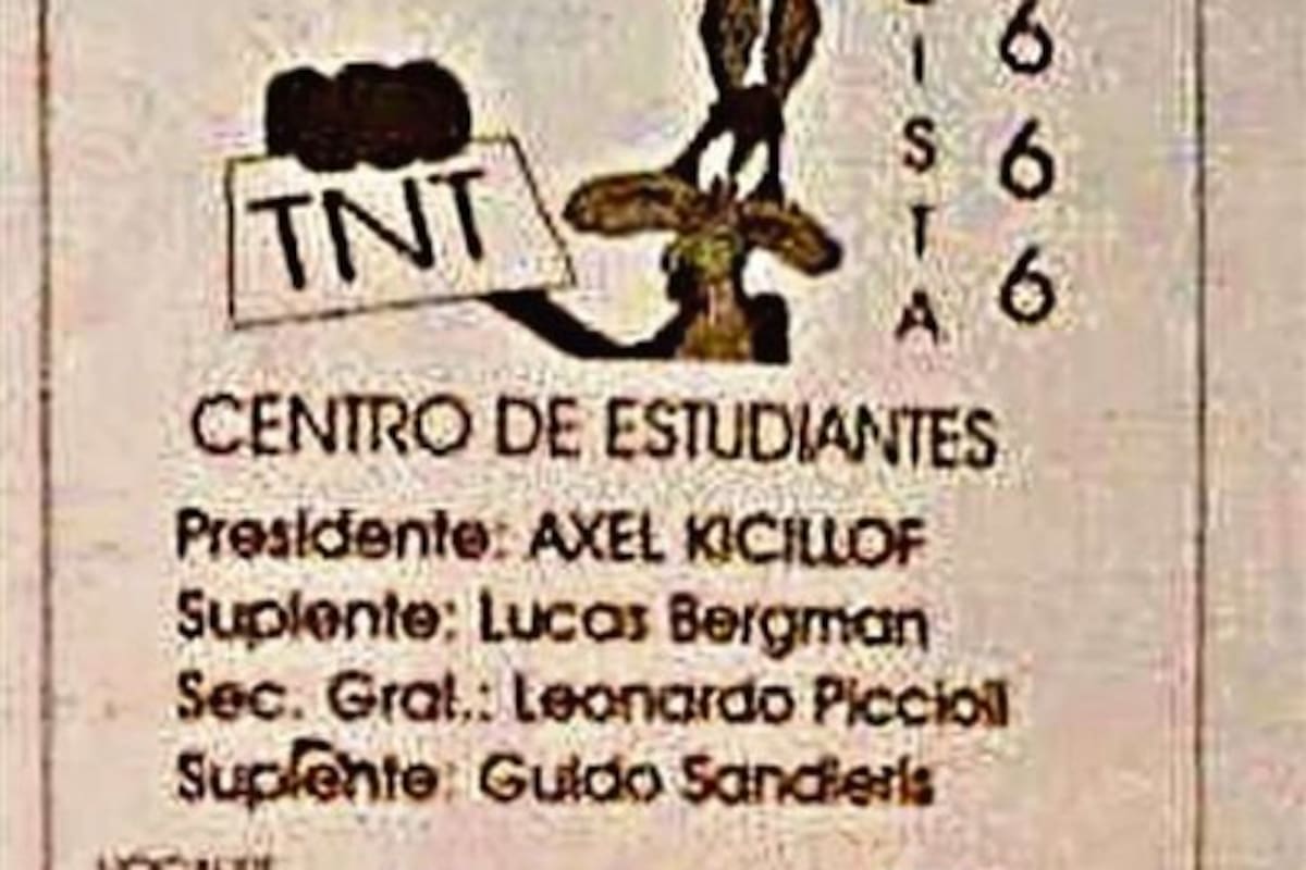 Eran jóvenes e idealistas, y seguramente no imaginaban que el futuro ubicaría a ambos muy cerca del poder, aunque en espacios diametralmente opuestos. Axel Kicillof , exministro de Economía de Cristina Kirchner, y Guido Sandleris , flamante titular del Banco Central del gobierno de Mauricio Macri, tuvieron una relación fluida que los llevó a compartir, allá por los inicios de este siglo, una lista conjunta para el centro de estudiantes de Ciencias Económicas de la UBA. La agrupación tuvo, por cierto, un nombre original: TNT, las iniciales de "tontos pero no tanto", acompañado por un dibujo del popular Coyote, aquel que perseguía sin éxito al no menos popular Correcaminos. También el número de la lista que eligieron para presentarse allá por 2001 era sugestivo: el triple seis. El hoy diputado nacional Kicillof fue en esa lista candidato a presidente del centro de estudiantes, mientras que Sandleris se postulaba a secretario general suplente. Junto a ellos estaban, entre otros, Leonardo Piccioli, autor del libro Soy solo, y los periodistas Lucas Bergman, Andrés Borenstein y Sebastián Campanario. Integrantes de aquella agrupación reconocen que tenía un tinte "progre", pero que los unía, sobre todo, el deseo de destronar a Franja Morada, la agrupación radical que una y otra vez ganaba las elecciones de los centros de estudiantes de esa concurrida universidad pública.
