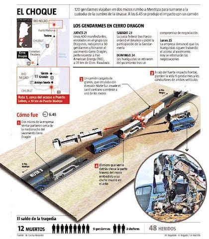 El trágico choque, que involucró a dos micros que llevaban a 120 gendarmes y un camión que transportaba granos, le costó la vida a nueve efectivos, que hasta horas antes habían permanecido en el yacimiento, en medio del conflicto con el grupo Los Dragones, una organización disidente de la Unión Obrera de la Construcción (Uocra).