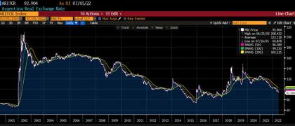 En este gráfico de arriba se muestra la historia del dólar desde el 2001 en adelante. Se pueden ver las apreciaciones y depreciaciones a lo largo del tiempo. Hay que aclarar que esto es el tipo de cambio real, multilateral, es una comparación del peso no con el dólar solamente, sino que incluye la inflación internacional y todas las monedas con las que comercia la Argentina. Parte de la gran devaluación de 300% de fines de 2001. Vemos también la era dorada del gobierno de Néstor Kirchner, con un tipo de cambio equilibrado, estable, competitivo, lo que le permitió tener superávit fiscal y de comercio. Después, durante el gobierno de Cristina hubo atraso cambiario, es decir, dólar barato para que podamos acceder a cosas que son caras. En 2015, se ve una devaluación que se produce cuando Macri con Prat-Gay liberan el cepo, aunque en el gráfico se ve que no es tan grande, es un pequeño pico de devaluación. Muchos creen que el siguiente fue el gran problema de Macri, y dan ganas de creerles: el atraso cambiario de la era Sturzenegger en el Banco Central, que fue generando una demanda de dólares por parte de la economía que se desata en una crisis cuando los mercados internacionales dijeron ‘sube la tasa de interés de EE.UU., todos hacia el dólar’. Dijeron: “hay que huir de la Argentina porque los argentinos, con un dólar tan barato, viven por encima de sus posibilidades y necesitan muchos dólares”. Enseguida tenemos toda la devaluación de Macri y, de nuevo, el atraso cambiario -que muchos juzgan demagógico- del actual Gobierno.