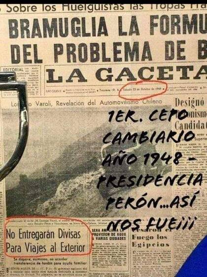 Para los que creen que es un problema solamente de falta de dólares lo que cabe es el cepo, porque el movimiento de pesos hacia dólares no estaría representando una anomalía ligada al problema fiscal. Es curioso: como señaló un brillante economista, cuando gobierna el peronismo es un golpe de mercado; y cuando gobierna Macri y faltan dólares es la fuga de los amigos del presidente, que “se la llevaron toda”. Vimos mil veces poner más restricciones, anunciar medidas que bloqueen más y más el acceso al mercado de cambios. En diciembre de 1948, el diario La Gaceta anunciaba: “No se entregarán divisas para viajes al exterior”. Fue el primer Perón, el que todavía no necesitaba de un ajuste, que llegó recién en el 52. Probablemente, el primer cepo.