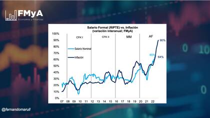 El problema político sigue siendo el mismo: la inflación que se dispara. En un gráfico de arriba, hecho por el economista Fernando Marull se muestra el problema actual, lo que viene y sobre todo la historia política de los últimos años. Toma desde el 2007 hasta ahora y observa la relación entre la inflación y el salario nominal. Entre mediados de 2010 y 2014, en el apogeo del segundo mandato de Cristina, se ven cómo los salarios nominales están muy por encima de la inflación. Eso podría pensarse como un triunfo político. Después, pierde en el 2015, cuando la inflación supera al salario. Cuando asume Macri la inflación supera al salario, pero en 2017 gana las elecciones y vemos el salario por encima de la inflación. Luego, viene un brote inflacionario en paralelo con las primarias del 2019. Cae la inflación caen los salarios en la gran recesión de la cuarentena y se dispara la inflación enloquecidamente. Pero los salarios la siguen y están parejos en este momento. Lo que sucede es que los economistas están pronosticando que a fin de año la inflación va a estar en 90%. Las paritarias la van a seguir porque en todos los convenios colectivos hay una cláusula que se dispara cuando se desboca la inflación respecto de lo acordado. Muy probablemente, lo anunció hoy el ministro de Trabajo, habrá una reapertura de paritarias en septiembre para recuperar lo perdido en materia de inflación.