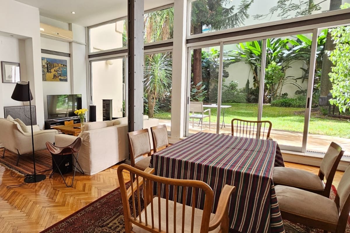 - Callao al 1600. Cuando pensamos en Recoleta, lo que seguramente se nos viene a la mente es la tranquilidad de la zona y su estilo racionalista. Y esa visión se refleja en un departamento del edificio de Callao al 1600, que parece una casa. Con espacios amplios de planta baja, lo que diferencia esta vivienda es su jardín propio, pues ya no quedan muchos así en la ciudad. Las vistas al verde, los árboles y el cantar de los pájaros combinan perfectamente con sus 4 ambientes luminosos. Esta unidad logra la intimidad de una casa en plena Ciudad de Buenos Aires.