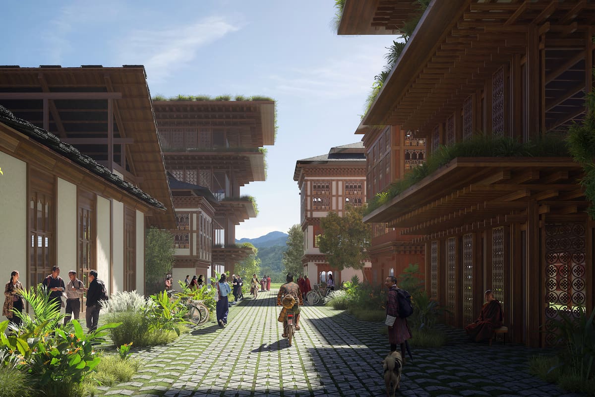 Los edificios que allí se realicen estarán construidos con materiales locales, como la madera, piedra y bambú. El diseño de esos inmuebles se inspirará en la arquitectura tradicional de Bután. Se construirán junto a calles pavimentadas permeables.