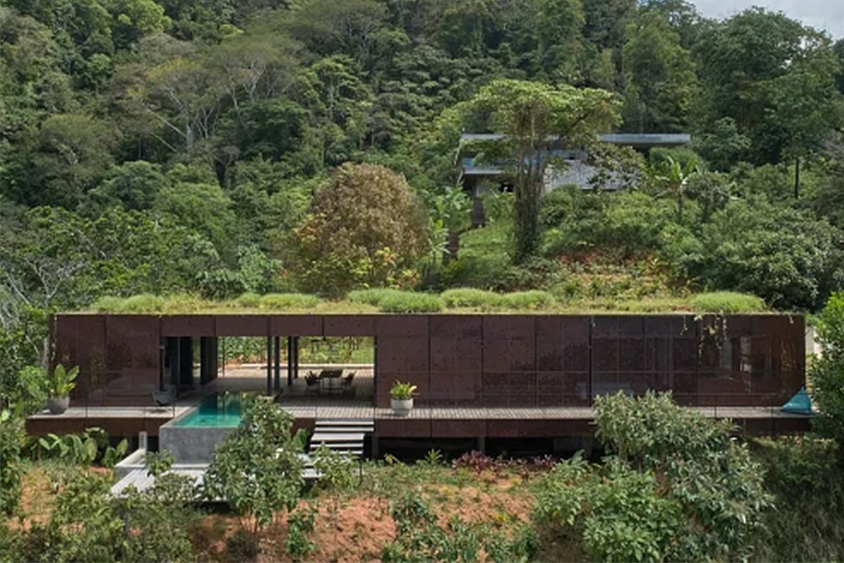 Ubicada en la jungla de Costa Rica, esta casa encarna la geología volcánica de sus alrededores. Ha sido impermeabilizada contra el aire húmedo mediante una técnica japonesa que consiste en carbonizar la madera de su pared trasera. La casa rectangular también está rodeada por una pantalla de aluminio oxidado que recuerdan la lava y las rocas volcánicas de la región; mientras que un patio cortado y una piscina interior y exterior aportan humedad y también un espacio de alivio refrescante.
