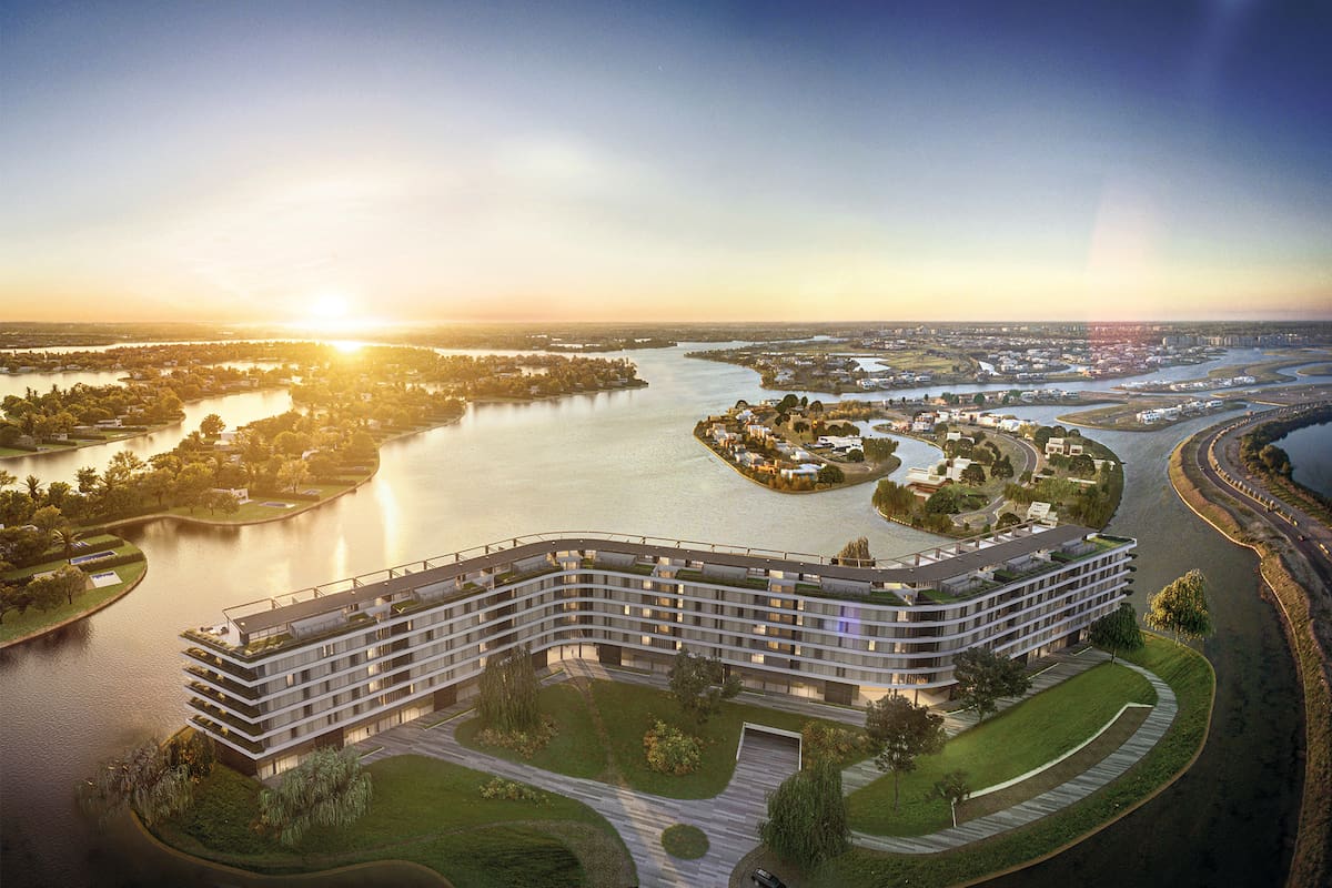 Otro de los puntos destacados de este gran emprendimiento es la orientación Este-Oeste y el diseño de unidades “pasantes”, lo que significa que es posible tener en cada departamento vistas tanto del amanecer como del atardecer, este último en un imponente horizonte sobre el espejo de agua del lago central. Por su parte, un innovador diseño de curvas y contracurvas organiza los espacios exteriores, alojando piletas y jardines privados.